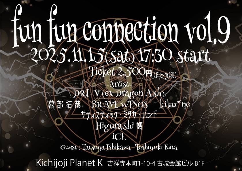 11月15日(Sta)fun fun connection vol.9@吉祥寺Planet K ACT}DRI-V(ex-Dragon Ash) / 暮部 拓哉 / Kiku ne / サディスティック・ミタカ・バンド / Higurashi蝉 / iCESTART : 17:30Ticket ¥2,500 12月27日(Sta)Tri-Uncle@LIVE labo YOYOGI Comming soon…